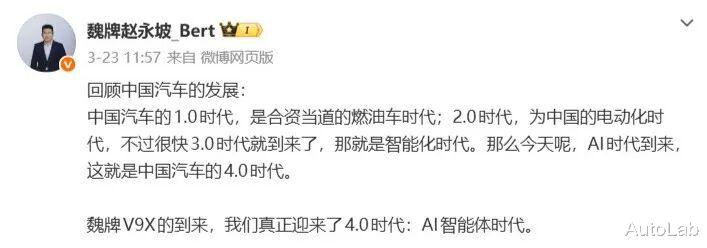 魏牌CEO赵永坡说,中国汽车进入了4.0时代。