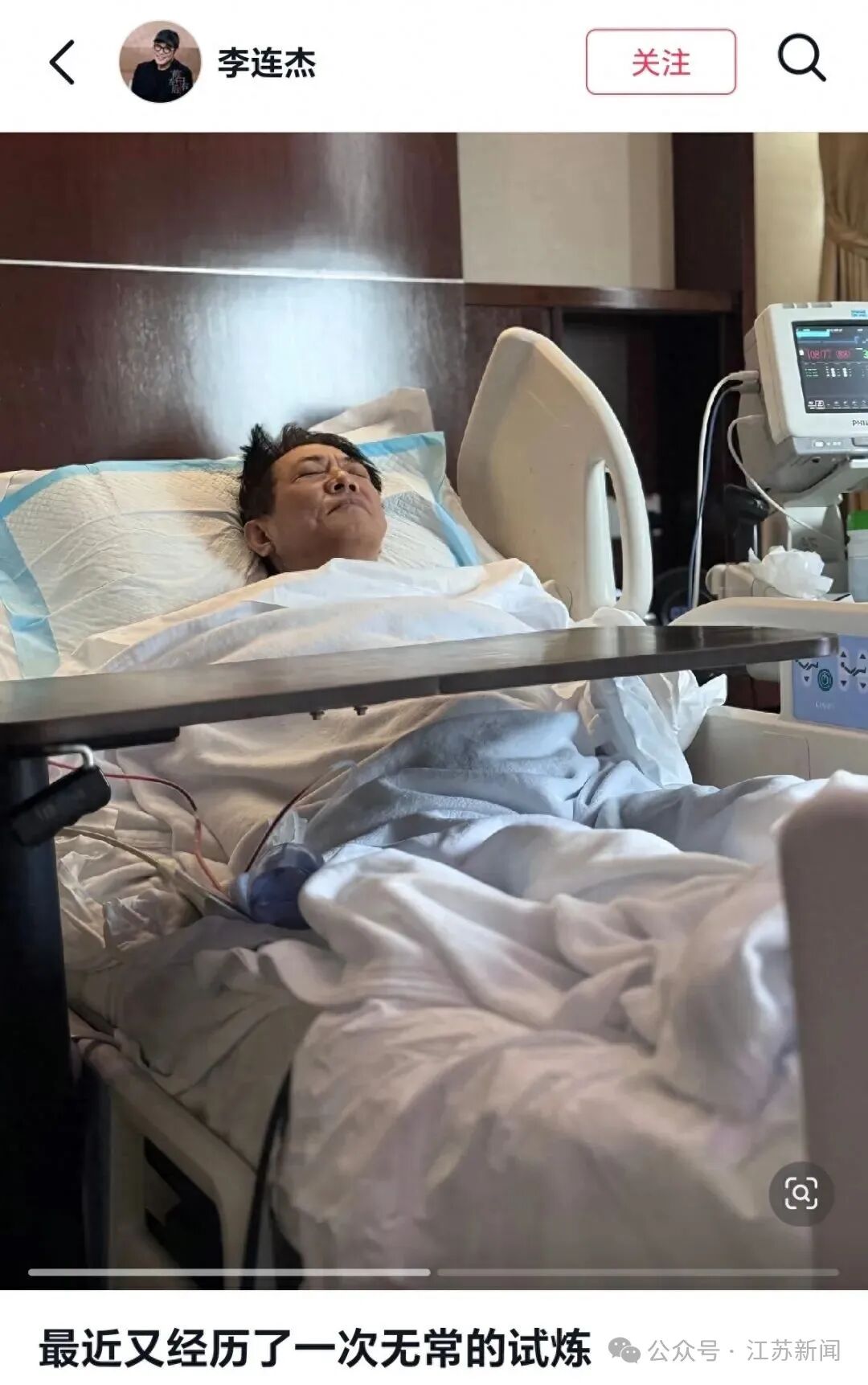 据此前报道漢崋资本,8月17日,李连杰在社交媒体上发布了自己躺在病床上的图片,并配文“最近又经历了一次无常的试炼”。